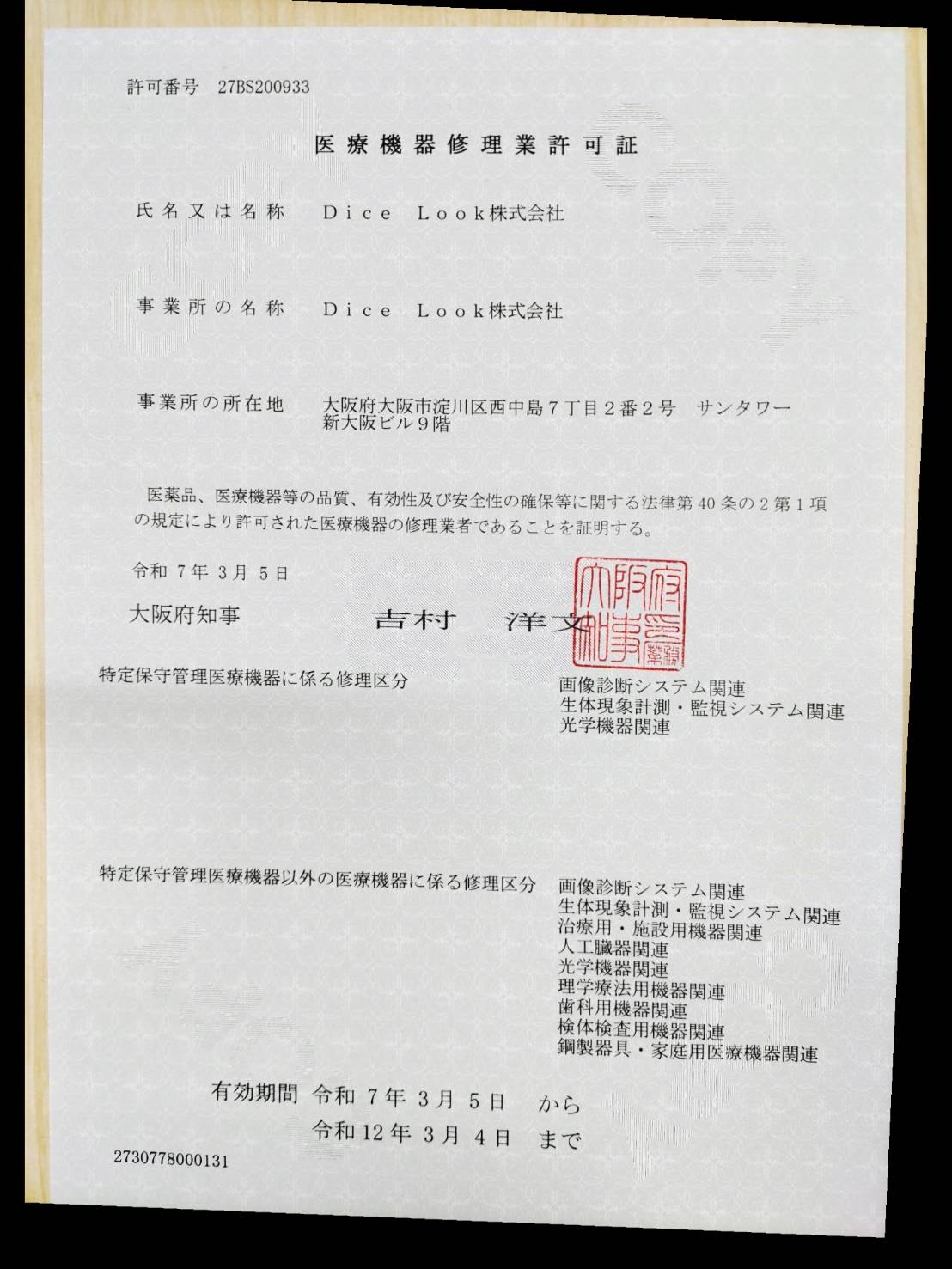 高度管理医療機器等販売業・貸与業許可を取得しました